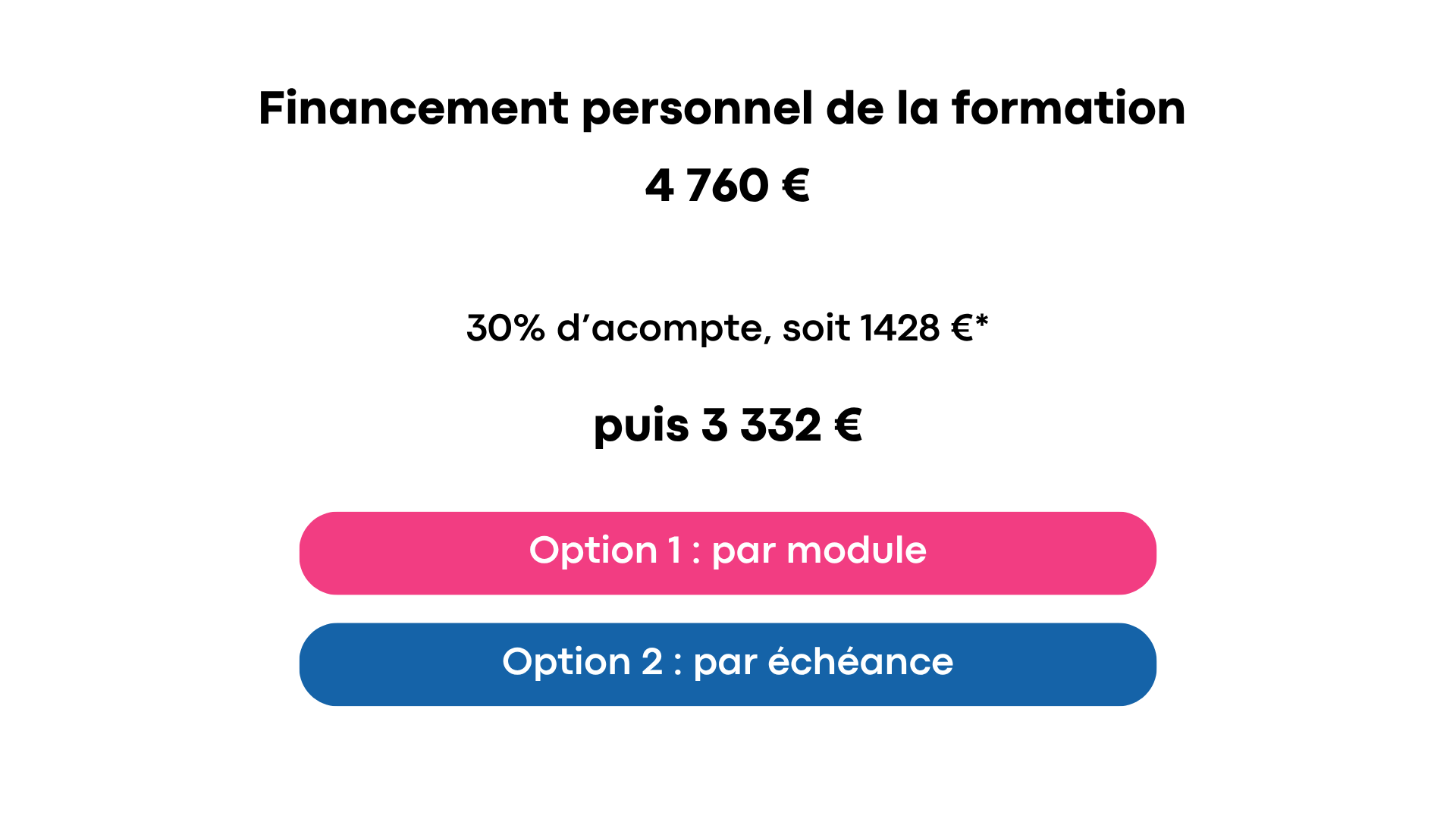 Nous proposons quatre options de financement qui permettent d’étaler votre paiement pendant la formation :